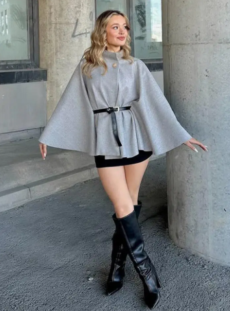 Dotée d’un col montant structuré, d’une ceinture ajustable et de détails dorés sophistiqués, elle redéfinit le chic intemporel. Sa coupe cape moderne sublime la silhouette avec légèreté et distinction, un véritable indispensable pour traverser la saison avec style et assurance.