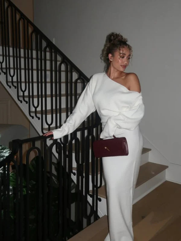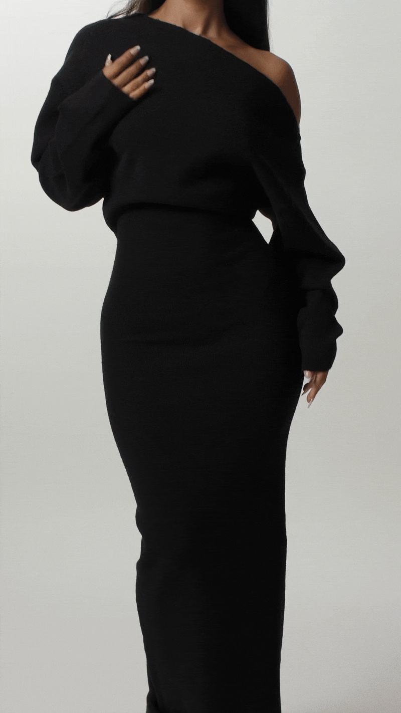 Élégante et sensuelle, cette robe longue dévoile subtilement l’épaule pour une allure à la fois féminine et moderne. Confectionnée dans une maille douce et extensible, elle épouse les courbes tout en offrant un confort absolu. Sa coupe épurée et son noir profond incarnent l’essence du chic minimaliste — parfaite pour une soirée raffinée ou un dîner élégant.